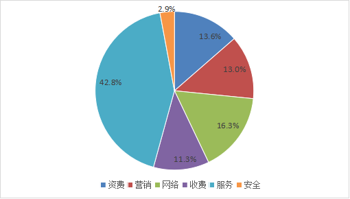 2022年第四季度,全省电信用户申诉问题中,涉及服务争议的电信用户申诉占比42.8%,涉及网络质量的电信用户申诉占比16.3%,涉及资费类问题的电信用户申诉占比13.6%,涉及营销类问题的电信用户申诉占比13.0%,涉及收费争议的电信用户申诉占比11.3%,涉及安全类问题的电信用户申诉占比2.9%。